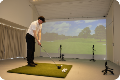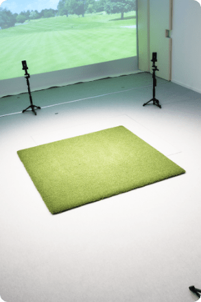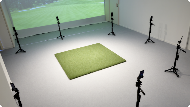 レッスン室には360°周囲8アングルから撮影できる機材が常設されています。前面の大型スクリーンには撮影したご自身のスイング動画をリアルタイムで投影しながらレッスンをさせていただきます。